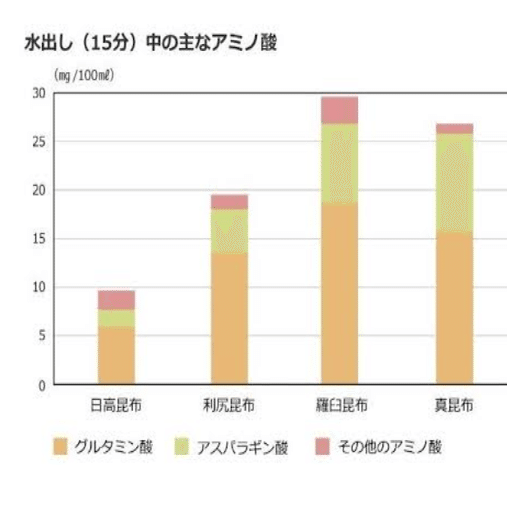 昆布はグルタミン酸に加え、アスパラギン酸を多く含んでいることが分かる。名前の通りアスパラガスに多く含まれるアミノ酸で、その名前もアスパラガスに由来します。アスパラギン酸は、体内で窒素やエネルギーの代謝に関係することが報告されています。